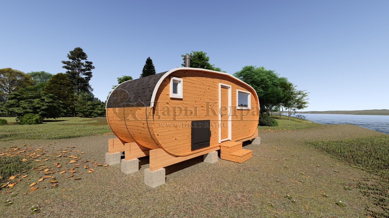 Симбиоз круглой и квадратной бани-бочки. Разработано с учётом эргономики, в ней так же просторно, как и в квадро-бочке, но при этом полукруглая крыша не дает задерживаться снегу и влаге на кровле. А еще такая баня безусловно красивая, мобильная и доступная каждому!