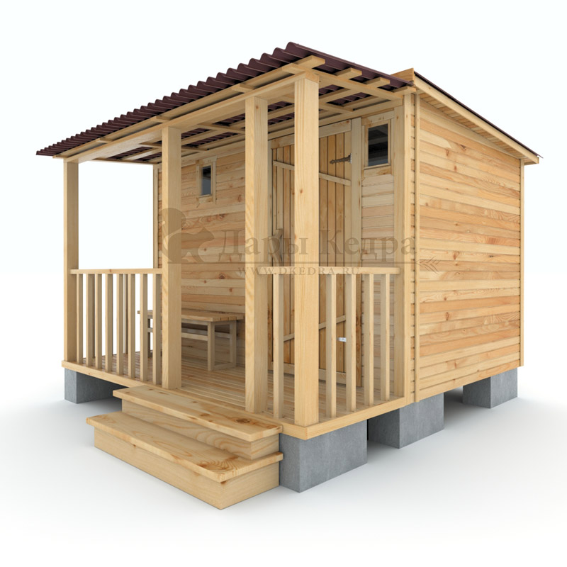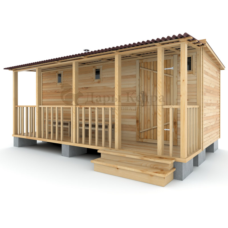 • Каркасно-щитовая баня из кедра «Стандарт» с верандой Это классическая прямоугольная модель бани с тремя отделениями: предбанником, моечной и парилкой. Для удобства пользования предбанник оснащен лавочкой и вешалкой. В моечной находится лавка и полочка из кедра. Парилка оборудована двухуровневым открытым полком и печью. За счет небольших размеров баня нагревается не более 30 минут. На просторной веранде можно оставить вещи или отдохнуть после парения. Каркасно-щитовую баню можно заказать как в готовом, так и в разборном варианте. В разборной модели готовые щиты из кедра быстро собираются в полноценное строение, что также позволяет исключить лишний строительный мусор. Такая баня не требует полноценный фундамент, поэтому при необходимости ее можно перенести в другое место. Обращаем Ваше внимание, что в стандартную комплектацию бани входит полок открытого типа в парной. Дополнительно можно заказать полок закрытого типа или лавку! Древесина кедра насыщена эфирными маслами и фитонцидами, которые активируются при воздействии температур. Таким образом, парение в каркаско-щитовых банях из кедра становится еще полезнее.