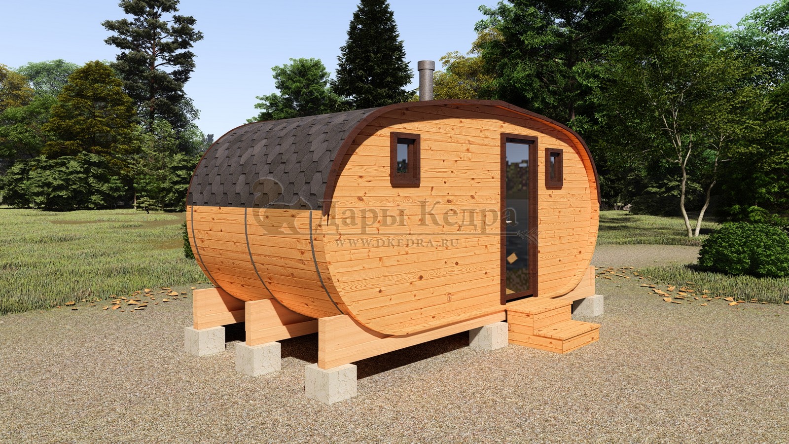 Овальная баня-бочка из кедра просторная и вместительная. Имеет два отделения: раздевалку, которую можно использовать как комнату отдыха, и парилку. Для удобства пользования раздевалка оснащена лавочкой, полкой и вешалкой из кедра. В парильном отделении располагается печь и двухуровневый открытый полок. Для установки такой модели не требуется полноценный фундамент, поэтому при необходимости ее можно перенести на другое место. Так же баню-бочку можно укомплектовать верандой со скамейками, козырьком и печью с внешней загрузкой, благодаря которой весь мусор после топки останется на улице.