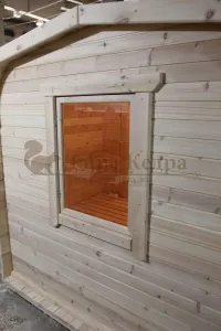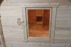 Окна из закаленного стекла (панорамное), можно разместить, как в парилке, так и в комнате отдыха. Может быть установлено только на торцевых (ровных) стенах бани. За дополнительную плату возможно сделать стекло бронзированным.