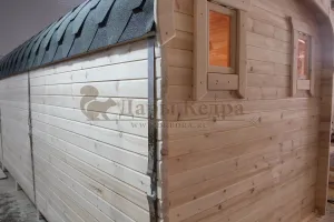Дополнительный источник света в темное время суток, а также с подсветкой баня будет выглядеть еще более оригинальной.