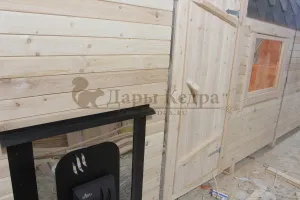 Данная опция позволяет доставить баню в труднодоступные места, куда выгрузка в собранном виде невозможна. Комплект для сборки обязательно полностью собирается на производстве, во избежание любых, даже малейших несостыковок, затем разбирается и нумеруется каждая деталь. Процесс сборки бани занимает примерно 1-2 дня, силами 2-3 человек (в зависимости от размера бани).
