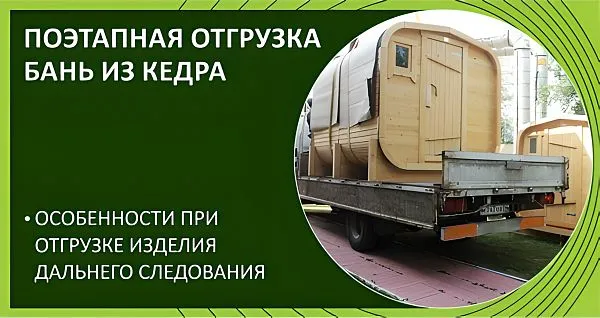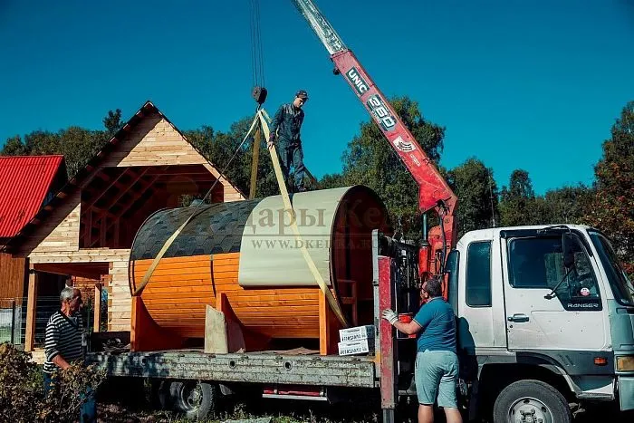 Сборный или разборный вид кедровой бочки доставляется на место установки непосредственно на манипуляторе (или длинномере с последующей разгрузкой манипулятором) и устанавливается на подготовленное заранее место. Для разобранной кедровой парной  заранее изготавливается специальная обрешетка груза, которую требуется самостоятельно снять после выгрузки.