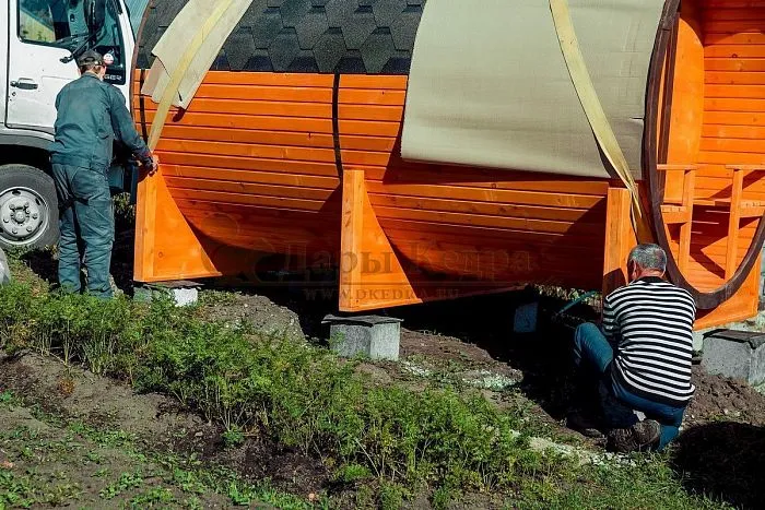 Любая баня-бочка является мобильной конструкцией, не требующей полноценного фундамента. О том, какое основание выбрать для кедровой парной мы рассказывали ранее в статье  «Варианты фундамента для мобильной бани». Доставка такой банной конструкции может быть осуществлена в сборном или разборном виде. Причем необходимо обратить внимание на особенности разгрузки изделия, чтобы процесс был оперативным и качественным.